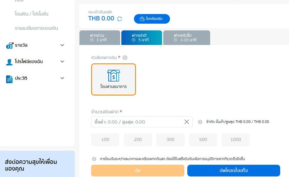• คริปโต เช่น USDT (ขึ้นอยู่กับหน้าฝากเงินที่ระบบแสดง ณ ขณะนั้น)