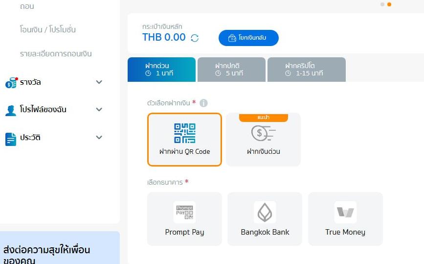 2. เลือกรูปแบบการฝากที่ต้องการ (ธนาคาร/QR/วอลเล็ต/คริปโต ฯลฯ)